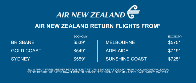 *Terms & Conditions apply: Valid for sales to 25 Mar 2026. Valid for travel commenced and completed within the period 20 Jul 2026 and 28 Feb 2027 (unless otherwise specified, please check with your travel broker). Closeout and blackout periods apply over school holidays and peak holiday periods and availability of seats is likely to be very limited over this time. Prices are ex Auckland as specified flying Seat Only Economy Class with Air New Zealand. Stopovers permitted, conditions apply, please check with your travel agent. Taxes correct as at 17 Mar 2026 but may be subject to change without notice. Flight restrictions may apply. Additional day of week surcharges may apply, please check with your travel agent. All components are strictly subject to availability. A Travel Professional service fee may apply. Travel requiring an overnight stay in New Zealand will be at passenger’s own expense. Prices shown are based on per person costs in New Zealand dollars, for payment by cash, cheque or eftpos only. Credit card sales are not permitted unless Travel Agent acts as a merchant. Strict cancellation fees apply. FINANCE CONDITIONS: Lending criteria, fees, terms and conditions apply.