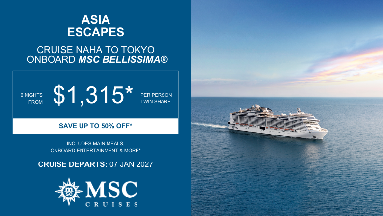 Thinking of Japan? Cruise from Okinawa to Tokyo and save up to 50%* on MSC's Asia Escape.