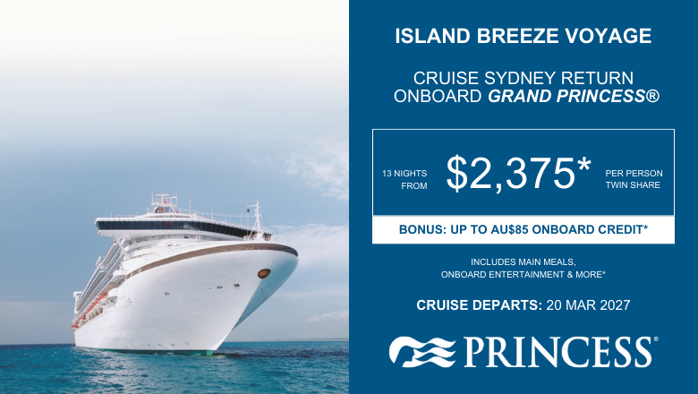 Or Princess's Island Breeze cruise provides an easy escape, plus AU$85* onboard credit per stateroom. For those seeking luxury, Seabourn’s Nordic Discovery includes a bonus US$300* onboard credit per suite.