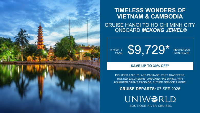 Cruise the Mekong and enjoy the Timeless Wonders of Vietnam & Cambodia onboard the Mekong Jewel, with a 14‑night package & bonus savings of up to 30%* on this remarkable river journey.