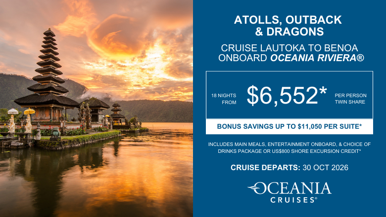 If you prefer to dive deeper into each destination, take advantage of generous shore excursion credits with Oceania’s Atolls, Outback and Dragons cruise. It’s the perfect way to experience authentic Fiji, explore Australia’s rugged interior, or immerse yourself in Balinese culture.