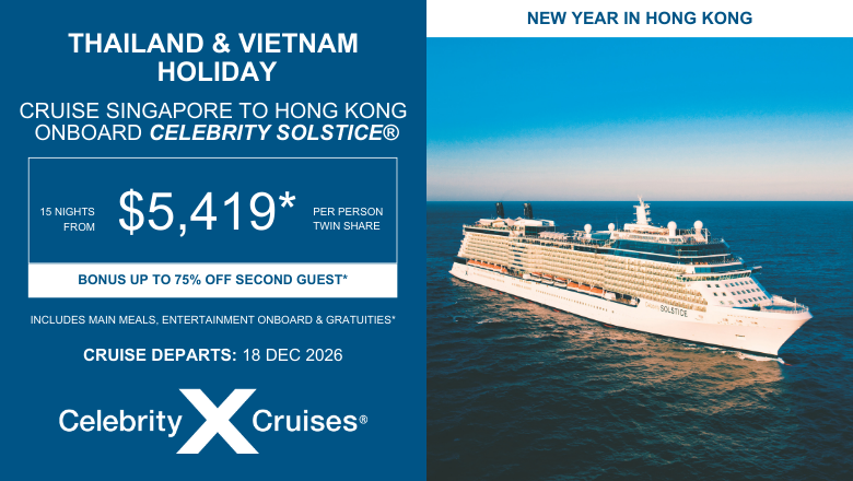 Looking for a getaway the kids will love? Enjoy a 9‑night South Pacific escape, with rates starting from just $95 per person, per night. Or ring in the New Year somewhere unforgettable — Celebrity Cruises’ Thailand and Vietnam Holiday ends in vibrant Hong Kong for a celebration like no other.