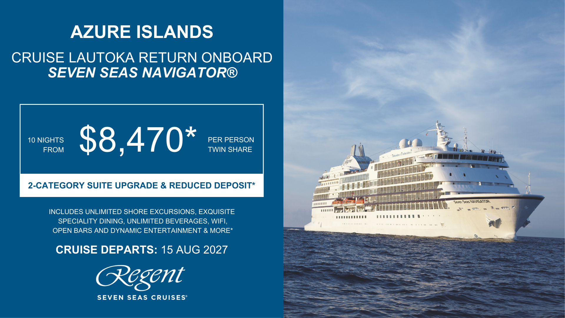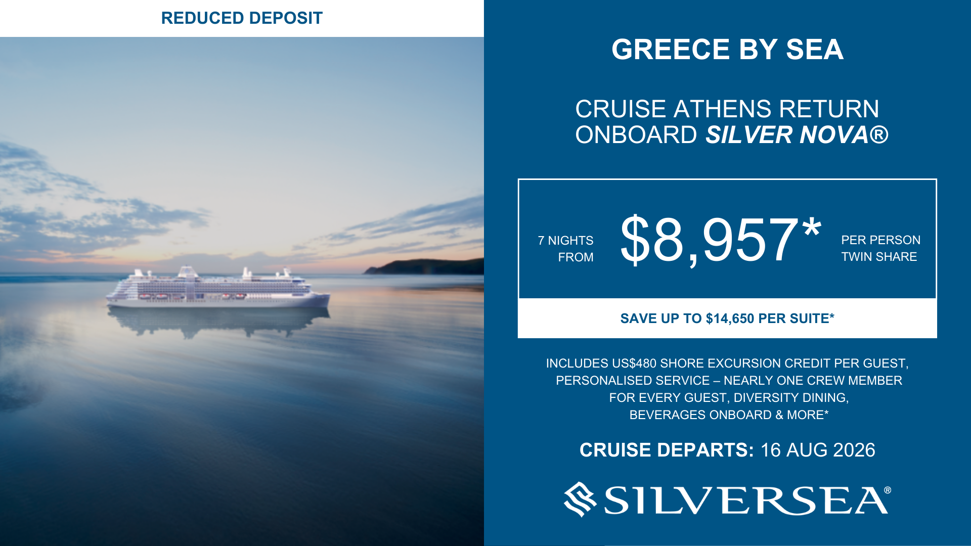 *Terms & Conditions: Valid for sales to 28 February 2026 (unless sold out prior) except Mediterranean Discovery: sales to 25 February 2026. All pricing is dynamic, meaning it can fluctuate based on seasonality, days of the week, availability, and demand. Prices correct as at 19 February 2026 when there was reasonable availability on the advertised price. Price is per person, in NZD, cruise only, applies to select sailings, based on double occupancy in specific categories. Deposits may not be refundable and cabin selection may not available and will be assigned closer to sailing date. Some staterooms may have obstructed views. New bookings only. Reflects all promotional savings. Savings amount varies by category and is per stateroom. All onboard credit amounts are per stateroom based on twin share and is not transferable, non-refundable and not redeemable for cash. For payment by cash, cheque or eftpos only. Credit card sales not permitted unless Travel Agent acts as a merchant. Events beyond our control such as currency fluctuations & changes to the price of aviation fuel may result in prices variations. FINANCE CONDITIONS: Lending criteria, fees, terms & conditions apply. |